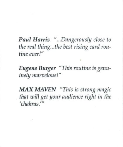 A very magical rendition of the rising card, performed in the spectator's hands. While I do not condone the use of non-Christian spiritualism such as the Sanskrit, Earth Mother, and the Goddess of Illusion as used in this effect, Jeff McBride has the talent of making an effect truly magical to the spectator. This manuscript is a good lesson in magical presentation, though I would highly recommend the magician change the patter line. Kundalini rising was originally published in the December 1987 issue of Genii magazine.