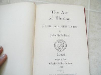 The Art of Illusion Magic for Men to Do by John Mulholland. NY Charles Scribner's Sons 1944. Ex library book, pocket and stamps. Book in good condition, some pencil lines, library stamp on one page. 2 pages have small edge tear. Some edgewear to cover.