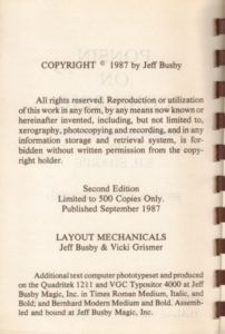 Softcover book. This book was Copyrighted in 1987 by Jeff Busby. It is a Second Edition, limited to 500 Copies Only. Published in September, 1987 by Jeff Busby Magic, Inc.