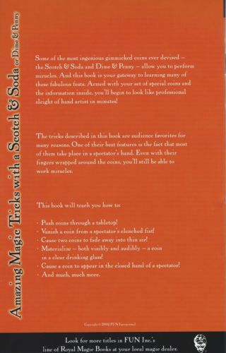 This terrific book teaches you spectacular magic tricks using some of the most ingenious magical coins ever devised...Scotch & Soda or Dime & Penny. You'll learn how to use these coins to perform incredible feats which make you look like a professional sleight-of-hand artist in just minutes!
