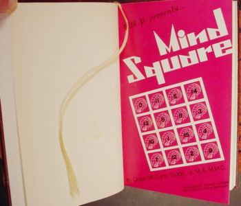 Hardcover book is 84 pages long. Features black and white illustrations throughout. Prologue by Stanton Carlisle. Epilogue by Bruce Bernstein. As described on the book advertisment, "Mind Square is a magic square, but like nothing seen before. Once learned, it can be done in the nude, for ANY number - POSITIVE or NEGATIVE!" Bruce Bernstein had the following to say about this book: "I can assure you that within this book is a routine guaranteed to stun any and all watching it... Even knowing most of the available short cuts myself, I was amazed at all the extra touches... Halfway through when he told me what squares were already filled and with what values, I knew I was seeing something unique." This book features an attached silk bookmark.