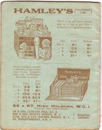 A pencil notation on the front covers dates this book as 1901. Published in London by that old, world renown magic dealer, Hamley Brothers Limited. Small in size, being only 4 x 5 ¼” inches, in wraps, illustrated with line drawings, and containing 24 pages.