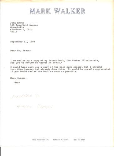 THE MASTER ILLUSIONISTS A Front Row Seat for Today's Greatest Magic Spectacles, by Mike Walker, published by Magical Publication, 1983. Hardback book in excellent condition including the dust jacket. Illustrated with many excellent photographs. Book is 11.5" x 8.5" 130 pages and includes a letter (unsigned) from Mark Walker to John Braun.