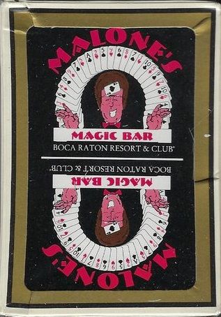 A deck of Bill Malone’s Magic Bar playing cards that was located for many years at the Boca Raton Resort & Club. Poker Size cards that were printed by Gemaco. New unopened condition. The box has some denting.
