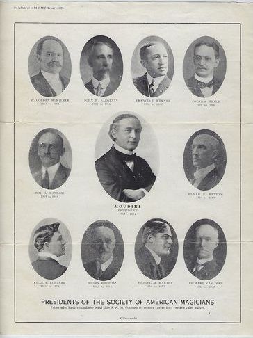This sheet was a supplement to the M.U.M. for February, 1921. It has photos and names of the presidents of the Society of American Magicians, from beginning in 1902. Houdini's photo, president in 1921 is featured in the center.