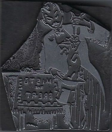 Magician in tux pulling rabbit out of hat with the name Misto the Great on his table