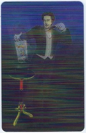 BACK: Color photo of a magician with his top hat on his table. This is an optical flicker card. When you move the card back and forth, the magician gestures with his wand, and the Queen of Hearts rises up out of the hat.