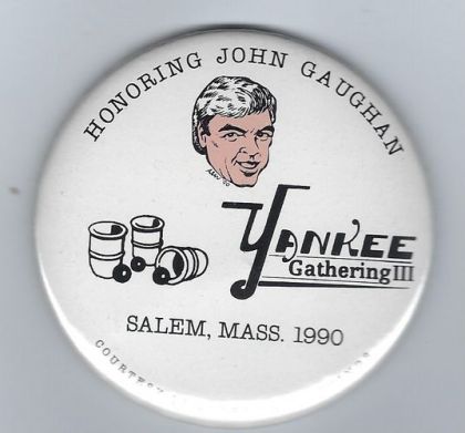 Gaughan bust right, beneath is Yankee Gathering logo consisting of stylized to "YANKEE' Gathering III" with underlines, to left of latter is a somewhat simplified rendering of the "cups-and-balls" logo of the New England Magic Collectors Association (NEMCA), beneath the latter two elements is "SALEM. MASS. 1990", beneath is "COURTESY OF ADVERTISING THINGS" curved across bottom, all black lettering and design except for beige skin coloring on Gaughan bust, white background. Drawing of Gaughan by Alan Wassilak. Yankee Gathering logo by Bob Schoof, original NEMCA cups-and-balls logo (a simplified form appears on the mirror) by Tom Walker.
