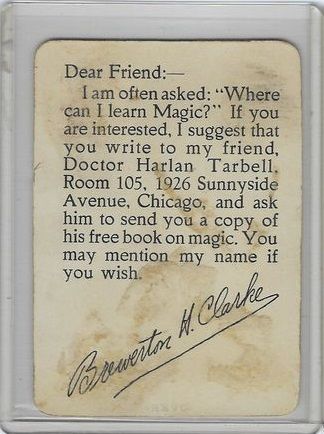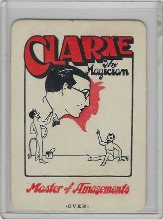 Front of Card show Clarke The Magician with 2 Devils drawing him, Has " Master of Amazements " on bottom of card, back has a offer to write his Friend Doctor Harlen Tarbell Room 105 1926 Sunnyside Avenue Chicago , for a copy of his Free book on Magic. Card was pulled from a scrapbook with Items dated between 1935 and 1939 . Has some dried up glue residue on back of card.