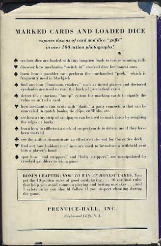 Comments: Over 270 hardbound pages on card and dice gaffs as well as all of the marks, peeks, and other sleight of hand techniques used by professional gamblers to cheat their unsuspecting victims.