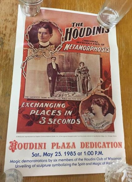 This is a large Houdini Plaza Dedication Poster, from the Sat. May 25, 1985, dedication ceremony for the opening of the Houdini Plaza in Appleton Wisconsin. Image on the poster was taken from the earlier poster used by Houdinit for his Metamorphosis Illusion.