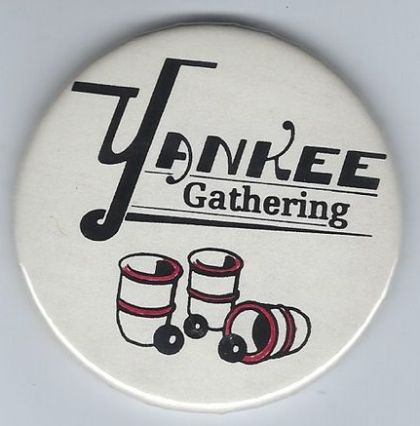 This is a round mirror issued at the Yankee Gathering I, in November of 1986. Image of cups and balls eith red highlighting. These were only issued to women who attended that first Yankee Gathering. They were not for sale on the NEMCA website.