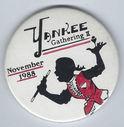 This is a round mirror issued at the Yankee Gathering II, in November of 1988. Image of a colonial magician in red vest holding a wand and ball vase. These were only issued to attendees at the Yankee Gathering. They were not for sale on the NEMCA website.