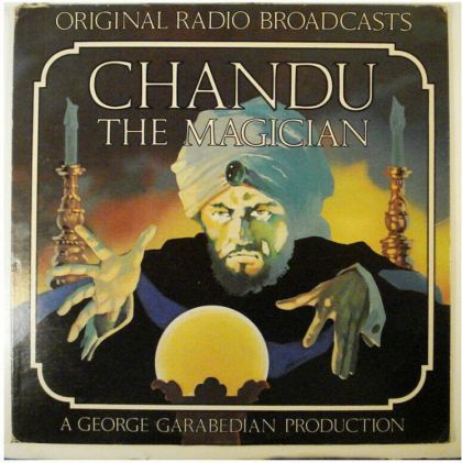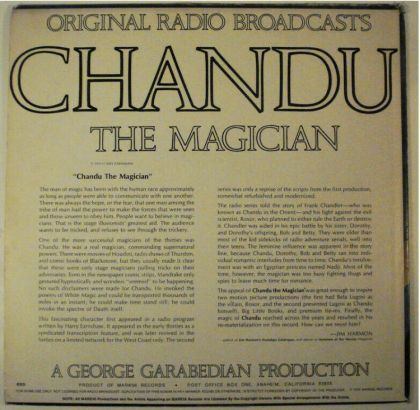 Chandu the Magician record, Original Radio Broadcasts, A George Garabedian Production, Marks 56 Records, 1974. Back of album cover has history of the Chandu radio programs.