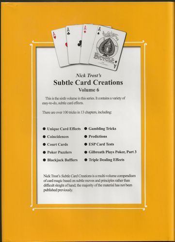 Comments: "This is the sixth volume in this series of easy-to-do, subtle card effects from master card creator Nick Trost. As in the rest of the books in this series, the card magic is based on subtle moves and principles rather than difficult sleight of hand."