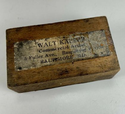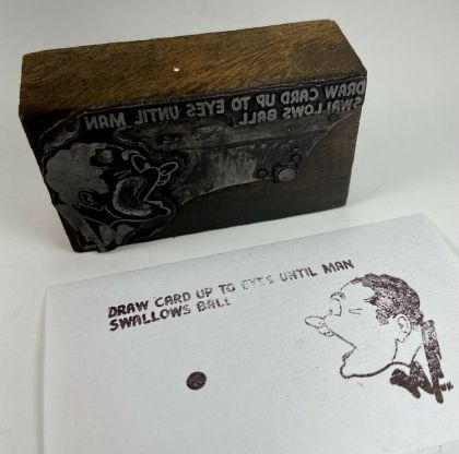 vintage letterpress printer's block. Made of white metal attached to a hardwood block, this block is for an optical illusion trick in which a man appears to swallow a ball as the viewer moves the image closer to their eyes. Likely dating to the 1940's, the block was made by Walt Kaeber, a well-known illustrator from Baltimore, Maryland, and still bears his company's sticker on the back. The block measures approximately 2-1/2" wide by 1-1/2" and is about 7/8" thick.