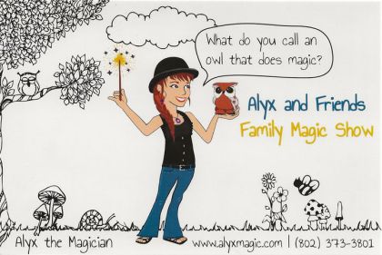 Alyx Hilshey Is a nationally touring family magician who works locally in Vermont. I've performed at prestigious magic theaters and have been sought after to perform and lecture at magicians' conventions. Notably, I was the feature entertainer and a workshop lecturer at the 2022 Kapital Kidvention (an esteemed national convention for children's entertainers). In November of 2021, I was on the cover of Vanish International Magic Magazine with the feature article.