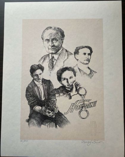 Set of 5 Harry Houdini Magician Prints signed & Remarqued by Artist Barry Simon who added a small pencil scetch to each print measuring 14X11. Artist Barry Simon is well known for his Scrimshaw art. This set is #36 of 595. Each print is on heavy high quality card stock paper. A very limited amount of sets with the Remarque were produced.