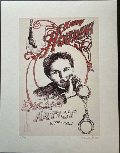 Set of 5 Harry Houdini Magician Prints signed & Remarqued by Artist Barry Simon who added a small pencil scetch to each print measuring 14X11. Artist Barry Simon is well known for his Scrimshaw art. This set is #36 of 595. Each print is on heavy high quality card stock paper. A very limited amount of sets with the Remarque were produced.