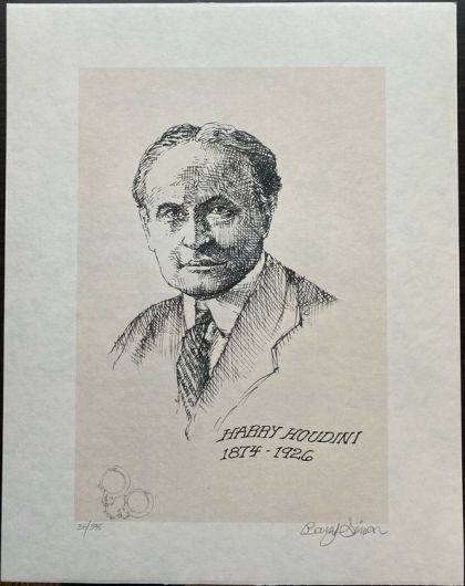 Set of 5 Harry Houdini Magician Prints signed & Remarqued by Artist Barry Simon who added a small pencil scetch to each print measuring 14X11. Artist Barry Simon is well known for his Scrimshaw art. This set is #36 of 595. Each print is on heavy high quality card stock paper. A very limited amount of sets with the Remarque were produced.