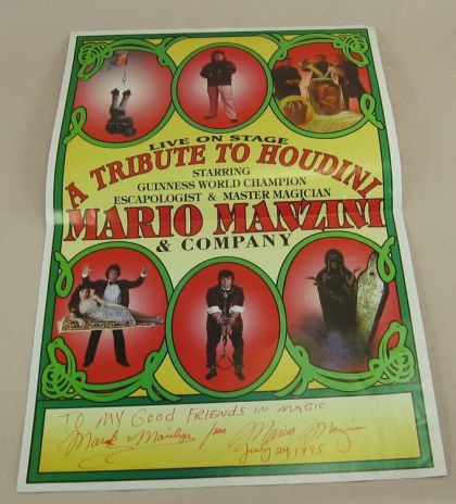 ORIGINAL MARIO MANZINI FULL COLOR POSTER SIGNED 1995. Beautiful and vibrant full color poster with vintage looking graphic and designs. Mario Manzini a multi-talented entertainer.... Magician, illusionist escape artist, and Elvis tribute artist, and Guinness world record holder!!! Poster is 11 x 17 inchwes and has been folded in half for mailing purposes. There is some slight wrinkling due to being mailed to me in just a plain manila envelope some 27 years ago from Mario