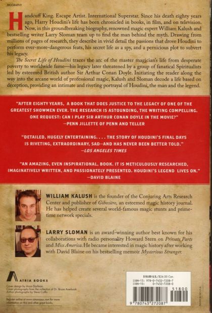 Handcuff King. Escape Artist. International Superstar. Since his death over eighty years ago, Harry Houdini's life has been chronicled in books, in film, and on television. Now, in this groundbreaking biography, renowned magic expert William Kalush and best-selling writer Larry Sloman team up to find the man behind the myth. Drawing from millions of pages of research, they describe in vivid detail the passions that drove Houdini to perform ever-more-dangerous feats, his secret life as a spy, and a pernicious plot to subvert his legacy.