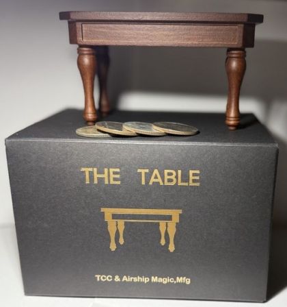 You show a small ornate wooden table that can be handed out for examination. You then introduce 4 half dollars and one by one cause the coins to visibly penetrate the table with no cover. At the end of the performance, you drape black silk over the table and with a gentle press cause the table to penetrate the working surface or vanish entirely.