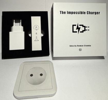 The phone charges from a simulated wall outlet on any flat surface! This is The Impossible Charger. When you insert the pin, it activates the charging illusion, and when you release it, it stops charging. You can attach it to various objects such as a book, a cup, a deck of cards, or even your head. It will automatically stick to any magnet-attracting surface. With its compact size, identical to a regular charger, you can easily carry it in your pocket or bag.