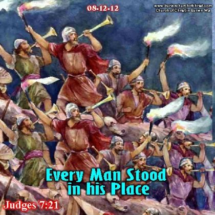 Judges 7:21 And every man stood in his place all around the camp; and the whole army ran and cried out and fled.