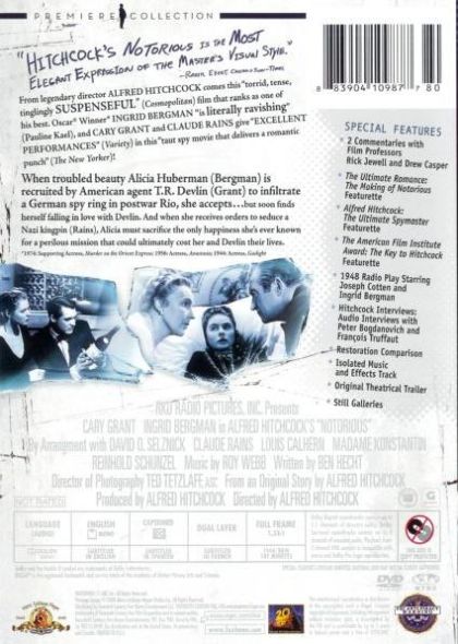 In order to help bring Nazis to justice, U.S. government agent T.R. Devlin recruits Alicia Huberman, the American daughter of a convicted German war criminal, as a spy. As they begin to fall for one another, Alicia is instructed to win the affections of Alexander Sebastian, a Nazi hiding out in Brazil. When Sebastian becomes serious about his relationship with Alicia, the stakes get higher, and Devlin must watch her slip further undercover.