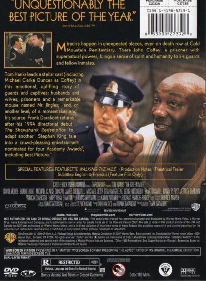 A supernatural tale set on death row in a Southern prison, where gentle giant John Coffey possesses the mysterious power to heal people's ailments. When the cell block's head guard, Paul Edgecomb, recognizes Coffey's miraculous gift, he tries desperately to help stave off the condemned man's execution.