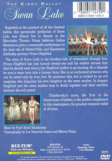 This classic Kirov production of Swan Lake by Oleg Vinogradov includes the familiar happy ending in the final act, where Siegfried fights and ultimately defeats the evil magician, von Rothbart, and at dawn is reunited with Odette.