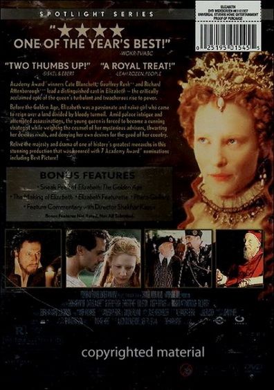 This film details the ascension to the throne and the early reign of Queen Elizabeth the First, as played by Cate Blanchett. The main focus is the endless attempts by her council to marry her off, the Catholic hatred of her and her romance with Lord Robert Dudley.