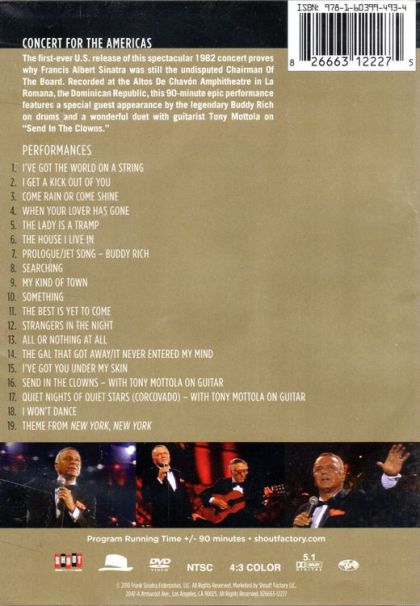 This first-ever U.S. release of this spectacular 1982 concert proves that even at age 66, Francis Albert Sinatra was still the undisputed Chairman Of The Board. Recorded at the Altos De Chavón Amphitheatre in La Romana, the Dominican Republic, this 90-minute epic performance features the legendary Buddy Rich on drums and a special guest appearance by guitarist Tony Mottola on a memorable rendition of Send In The Clowns. Performances: 1.I ve Got The World On A String 2.I Get A Kick Out Of You 3. Come Rain Or Come Shine 4.When Your Lover Has Gone 5.The Lady Is A Tramp 6.The House I Live In 7.Prologue/Jet Song Buddy Rich 8.Searching 9. My Kind Of Town 10. Something 11. The Best Is Yet To Come 12. Strangers In The Night 13. All Or Nothing At All 14. The Gal That Got Away/It Never Entered My Mind 15. I ve Got You Under My Skin 16. Send In The Clowns With Tony Mottola On Guitar 17. Quiet Nights Of Quiet Stars (Corcovado) 18. I Won t Dance 19. Theme From New York, New York