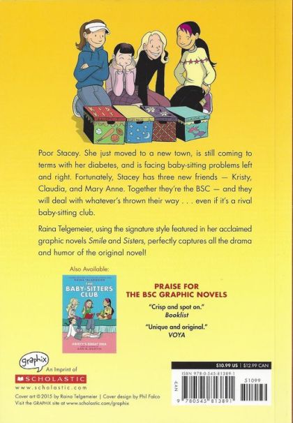 A graphic novel adapted and illustrated by Raina Telgemeier, the #1 New York Times bestselling, multiple Eisner Award-winning author of Smile!Poor Stacey. She just moved to a new town, is still coming to terms with her diabetes, and is facing baby-sitting problems left and right. Fortunately, Stacey has three new friends -- Kristy, Claudia, and Mary Anne. Together they're the BSC -- and they will deal with whatever's thrown their way... even if it's a rival baby-sitting club!