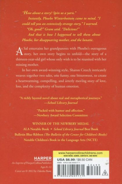 "How about a story? Spin us a yarn." Instantly, Phoebe Winterbottom came to mind. "I could tell you an extensively strange story," I warned."Oh, good!" Gram said. "Delicious!"And that is how I happened to tell them about Phoebe, her disappearing mother, and the lunatic.As Sal entertains her grandparents with Phoebe's outrageous story, her own story begins to unfold--the story of a thirteen-year-old girl whose only wish is to be reunited with her missing mother.In her own award-winning style, Sharon Creech intricately weaves together two tales, one funny, one bittersweet, to create a heartwarming, compelling, and utterly moving story of love, loss, and the complexity of human emotion.
