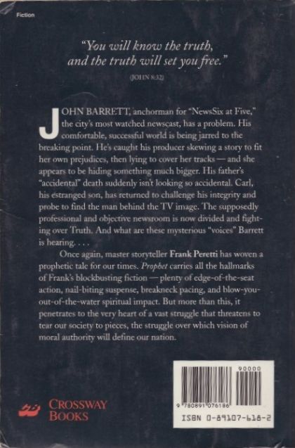 John Barrett, anchorman for " NewsSix at Five, " the city's most watched newscast, has a problem. His comfortable, successful world is being jarred to the breaking point. He's caught his producer skewing a story to fit her own prejudices, then lying to cover her tracks--and she appears to be hiding something much bigger. His father's " accidental" death suddenly isn't looking so accidental. Carl, his estranged son, has returned to challenge his integrity and probe to find the man behind the TV image. The supposedly professional and objective newsroom is now divided and fighting over Truth. And what are these mysterious " voices" Barrett is hearing.... Once again, master storyteller Frank Peretti has woven a prophetic tale for our times. "Prophet carries all the hallmarks of Frank's blockbusting fiction--plenty of edge-of-the-seat action, nail-biting suspense, breakneck pacing, and blow-you-out-of-the-water spiritual impact. But more than this, it penetrates to the very heart of a vast struggle that threatens to tear our society to pieces, the struggle over which vision of moral authority will define our nation.