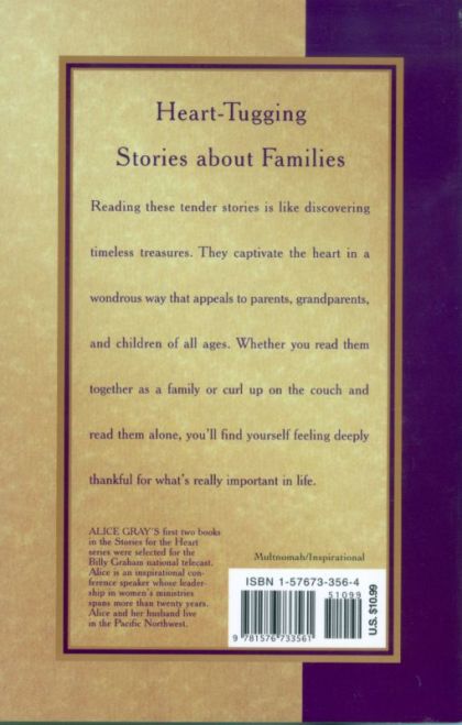 This treasury of family stories continues in the style of two previous bestsellers by Alice Gray, Stories for the Heart and More Stories for the Heart, both featured on Billy Graham's national TV broadcasts. Her tender stories deliver Christian values in a captivating and wondrous way that appeals to parents, grandparents, couples, and single moms. They're ideal for families to read together or for anyone to curl up with on the couch and read alone. Contributors include bestselling authors like Max Lucado, Chuck Swindoll, Billy and Ruth Graham, Tony Campolo, Paul Harvey, Erma Bombeck, and Philip Gulley. Whenever a family needs an emotional or spiritual pick-me-up, this book is the answer.