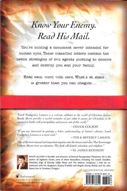 Randy Alcorn's gripping bestseller delivers us from ignorance of the devil's schemes. Foulgrin, a high-ranking demon, instructs his subordinate on how to deceive and destroy Jordan Fletcher and his family. It's like placing a bugging device in hell's war room, where we overhear our enemies assessing our weaknesses and strategizing attack. Lord Foulgrin's Letters is a Screwtape Letters for our day, equally fascinating yet destinctly different-a dramatic story with earthly characters, setting, and plot. A creative, insightful, and biblical depiction of spiritual warfare, this book will guide readers to Christ-honoring counterstrategies for putting on the full armor of God and resisting the devil. Alcorn says to win the battle we must know our God, know ourselves, and know our enemy. Lord Foulgrin's Letters, in unparalleled and compelling fashion, helps us better know each.