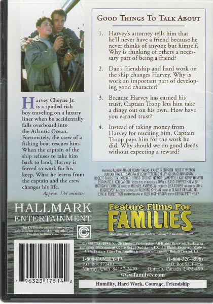 Harvey Cheyne, Jr., second richest person in the world, orphaned and spoiled rotten, encounters a cigar and the sea on his way to England for boarding school. Seasick, over the rail for real, rescued by Dan Troop of a Gloucester fishing sailboat. Three months at sea, under a firm but fair Captain Troop (fair wages of $10.50 a month, if you don't work you don't eat). A hard life and a dangerous one, and a lot of growing up to do through hardship and tragedy.
