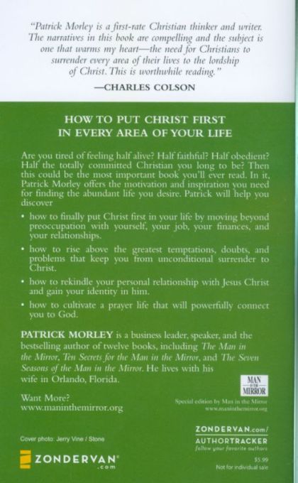 Are you tired of feeling half alive? Half faithful? Half obedient? Half the totally committed Christian you long to be? Then this could be the most important book you'll ever read. In it, Patrick Morley offers the motivation and inspiration you need for finding the abundant life you desire. Patrick will help you discover: how to finally put Christ first in your life by moving beyond preoccupation with yourself, your job, your finances, and your relationships; how to rise above the greatest temptations, doubts, and problems that keep you from unconditional surrender to Christ; how to rekindle your personal relationship with Jesus Christ and gain your identity in Him; how to cultivate a prayer life that will powerfully connect you to God.