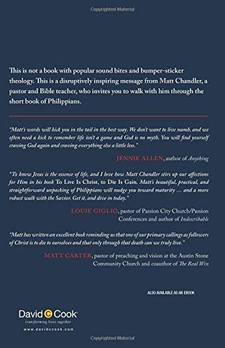 Using Paul's radical letter to the Philippians as his road map, Matt Chandler forsakes the trendy to invite readers into authentic Christian maturity. The short book of Philippians is one of the most quoted in the Bible, yet Paul wrote it not for the popular sound bites, but to paint a picture of a mature Christian faith. While many give their lives to Jesus, few then go on to live a life of truly vibrant faith. In this disruptively inspiring book, Chandler offers tangible ways to develop a faith of pursuing, chasing, knowing, and loving Jesus. Because if we clean up our lives but don't get Jesus, we've lost! So let the goal be Him. To live is Christ, to die is gain--this is the message of the letter. Therefore, our lives should be lived to Him, through Him, for Him, with Him, about Him--everything should be about Jesus.