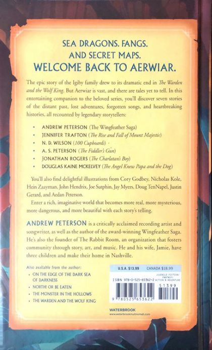 Return to the world of the Wingfeather Saga (more than one million copies sold!) with Andrew Peterson and his all-star author friends.Immerse yourself in a land of bomnubbles and quarreling cousins, sea dragons and book publishers, thieves and Fangs and secret maps. Here within these pages lie seven stories of the distant past, lost adventures, forgotten songs, and heartbreaking histories. The Shining Isle is restored, but Aerwiar is vast—and these authors have tales yet to tell: • Explore the inner walls of Yorsha Doon, just West of the Woes of Shreve, on the edge of the Dark Sea of Darkness, from the eyes of young Safiki in “The Prince of Yorsha Doon” from the creator of Aewiar, Andrew Peterson.• Jennifer Trafton's warm and whimsical writing brings to life a publishing nightmare populated by the many beasts of Skree in “The Wooing of Sophelia Stupe.”• Learn the origins of Ollister Pebmrick's mysterious entry in the Creaturepedia about his encounter with a raggant in “Willow Worlds” by N. D. Wilson.• Travel with young Podo Helmer on an epic hunt for sea dragons in “From the Deeps of the Dragon King” from A. S. Peterson.• Jonathan Rogers presents “The Ballard of Lanric and Rube,” sung by Armulyn the Bard, tale-spinner of the imaginary Shining Isle of Anniera, in On the Edge of the Dark Sea of Darkness.• Discover what life was like for Maraly and Gammon in post-war Skree in “Shadowblade and the Florid Sword"—the first-ever Wingfeather comic—by Andrew Peterson. • Douglas McKelvey's epic, heartbreakingly hopeful novella "The Places Beyond the Maps” recounts a father's journey to redemption.You'll also find delightful illustrations by Justin Gerard, Hein Zaayman, Cory Godbey, John Hendrix, Nicholas Kole, Aedan Peterson, Joe Sutphin, Jay Myers, and Doug TenNapel.Enter a rich, imaginative world that becomes more real, more mysterious, more dangerous, and more beautiful with each story's telling.Can’t get enough of Aerwiar? Collect the whole set!ON THE EDGE OF THE DARK SEA OF DARKNESS • NORTH! OR BE EATEN • THE MONSTER IN THE HOLLOWS • THE WARDEN AND THE WOLF KING • WINGFEATHER TALES • PEMBRICK’S CREATUREPEDIA • A RANGER’S GUIDE TO GLIPWOOD FOREST