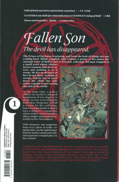 This is the one true tale of what befell the Prince of Lies, the Bringer of Light-Lucifer. The blind, destitute old man, who lives in a small boarding house in a quiet little town, where nothing is quite what it seems and no one can leave. He's trapped, you see? Trapped in a bizarre prison with no memory of how he got there or why. He has no recollection of setting out to find his offspring. He also does not remember that if he does not find him it could be the end of all things. Meanwhile, in Los Angeles, a cop who may have brain cancer is tasked with a mission: find and kill Lucifer. Collects Lucifer #1-6 and The Sandman Universe Special #1.