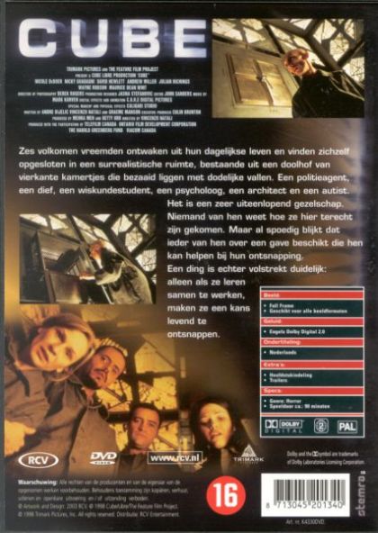 Seven people awake to find themselves in a cube-shaped room, with no memory of how they came to be there or of each other. Traped within the Cube, a grid of identical cubic rooms, the strangers struggle to understand the purpose of this enigmatic construction and its builders and to solve the puzzle that will lead them to the exit. As the group explores, they must contend with the dangers posed by their prison, rooms that hold traps, of a variety of lethal designs. Each member seems to have a skill needed to survive, but as the traps take their victims the chances for survival grow slimmer, and the group itsself becomes a threat, as the members grow suspicious that one of their number may be a traitor working for the architects of the cube.