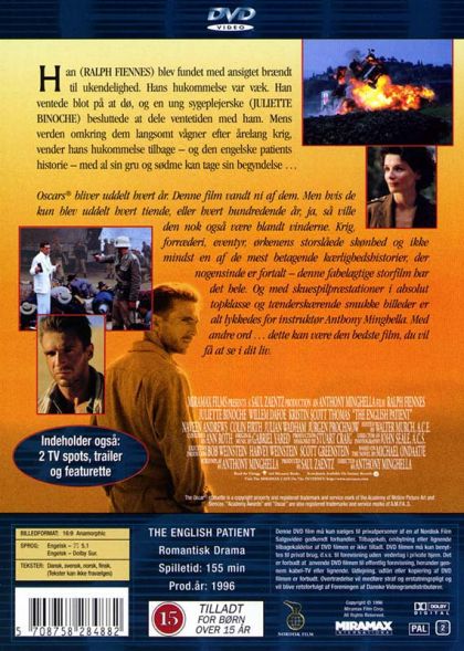 Against the backdrop of World War II, the lives of a badly burned patient with amnesia (Ralph Fiennes), his nurse Hana (Juliette Binoche) and his lover Katharine (Kristen Scott Thomas) intertwine. Through flashbacks from an abandoned house in Italy, the patient's life story as a mapmaker in the North African desert is gradually reconstructed, and his identity is revealed. Troubling questions about his past life are raised by Caravaggio (Willem Defoe) while Hana begins a romance of her own with a sapper she meets while tending to her patient in Italy.