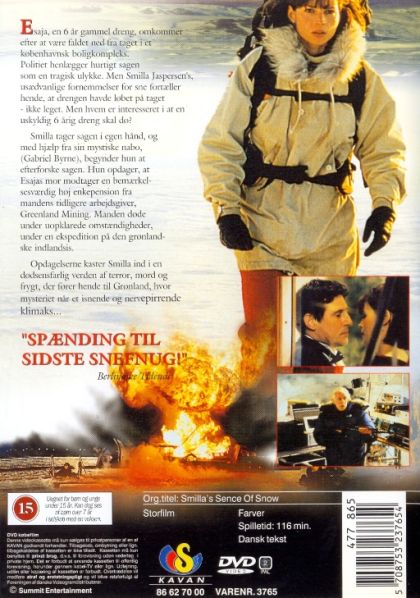 Smilla Jaspersen (Julia Ormond) is from Greenland but is living in Copenhagen. A little boy falls off of the roof of the building where she lives, and he dies. It is said to be an accidental death, but Smilla happens to be an authority on snow and ice, and she finds out from his footprints that he had been chased by someone right before he fell. She starts doing her own detective work and becomes friends and maybe more with one of her neighbors, who is a mechanic (Gabriel Byrne). Smilla then finds clues which implicate a corporation that is making clandestine trips to Greeland for unknown reasons, and they might be involved in the child’s demise.