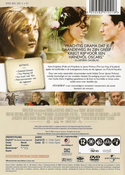 The movie "Atonement" (2000) is set in 1930s England which was a time when the second world war was imminent. Briony Tallis (Romola Garai) is a wealthy young woman who lives with her privileged family in their huge mansion. Briony’s family gather one hot and humid weekend and tensions surface. Briony witnesses her sister Cecilia (Keira Knightley) and a servant’s son, Robbie (James McAvoy), together and misinterprets what is happening which results in Robbie’s arrest. After three years in prison, Robbie joins the army and fights the German army in France. During this time Robbie and Cecelia exchange letters and are still in love; meanwhile Briony is working as a nurse for the war wounded. Briony realizes that she must apologize to Robbie and recant her testimony but it seems she never does so. Robbie and Cecilia die before they can be reunited and an elderly Briony (Vanessa Redgrave) realizes that she can never atone for what she did to her sister and her sister’s lover.