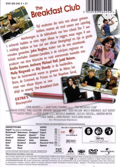Five teenagers from radically different social groups spend a Saturday morning in detention at their high school library. Over the course of the day, they learn lessons about each other and themselves. Claire (Molly Ringwald) is the spoiled princess, Andy (Emilio Estevez) is the popular jock, Brian (Anthony Michael Hall) is the brainy nerd, Allison (Ally Sheedy) is the misfit, and John Bender (Judd Nelson) is the juvenile delinquent with the heart of gold. The five form an unusual alliance against Principal Vernon (Paul Gleason) as they navigate the uneasy waters of high school social cliques and become friends through a series of shenanigans and heartfelt conversations.