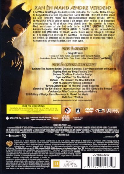 In a retelling of the origin of the comic book hero Batman, young Bruce Wayne witnesses the murder of his parents after an opera. Upon reaching adulthood (having been raised by his family butler, Alfred) he returns home to Gotham City with plans of killing the man who murdered his parents (who is now being released in return for testimony against the mob). Instead, the mob kills the thug to prevent his testimony. Bruce confronts them, only to be dismissed. He decides to travel the world, learning combat techniques including those of a secret vigilante group. He returns home once again, capitalizing on his childhood fear of bats and contacts in his father's advanced technology company to create the persona "Batman." He then battles the evil "Scarecrow" and his deadly toxins, and eventually must face the leader of the vigilante group he had earlier trained with, who now plans to destroy the city.